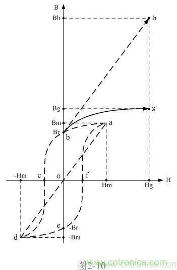 圖2-10中,虛線b-h只是無數條等效磁化曲線中的一條。當第一個交流脈沖的正半周電壓輸入時,如果開關變壓器的伏秒容量足夠大,磁感應強度B將會沿著這條新的等效磁化曲線b-h進行,由上次剩余磁感應強度Br的位置開始向新的最大值Bh = Br+2Bm攀升。