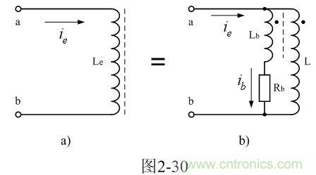 圖2-30-a中,Le是一個同時考慮渦流損耗因素的電感;L是變壓器原初級線圈的電感;Rb是鐵芯渦流損耗電阻;Lb是一個互感線圈,通過它把流過電阻Rb的電流感應到變壓器初級線圈中;當流過電阻Rb的電流增加時,流過通過Lb互感線圈的感應作用,使流過變壓器初級線圈L的電流也同時增加。