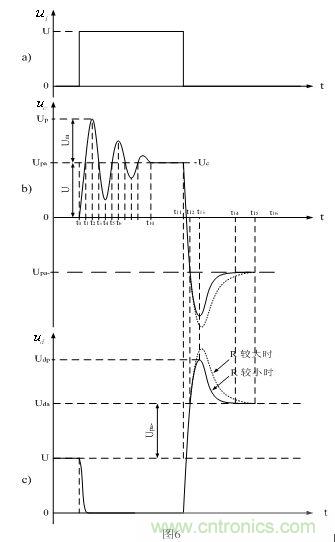 這里順便指出,圖6-b的波形是很難測(cè)量到的,因?yàn)榉植茧姼蠰s與分布電容Cs產(chǎn)生自由振蕩的過(guò)程,基本上都在變壓器內(nèi)部的分布電感與分布電容之間進(jìn)行,用儀器很難直接進(jìn)行測(cè)量;但通過(guò)測(cè)量變壓器次級(jí)線圈的波形,也可以間接測(cè)量圖6-b中波形的振幅;而圖6-c的波形可以直接進(jìn)行測(cè)量,兩者的振幅均與分布電感Ls的數(shù)值大小有關(guān),還與等效電阻R的阻值有關(guān)。分布電感Ls的數(shù)值越大,振幅也越大,等效電阻R的阻值越大,振幅也越大。