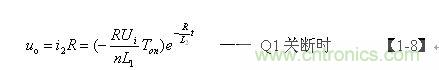 【1-8】式中,L1、L2分別為開(kāi)關(guān)變壓器初、次級(jí)線圈的電感,n為開(kāi)關(guān)變壓器線圈的匝數(shù)比,n=N2/N1,Ui為變壓器初級(jí)線圈的輸入電壓,Ton為開(kāi)關(guān)管的導(dǎo)通時(shí)間,R為等效負(fù)載電阻。