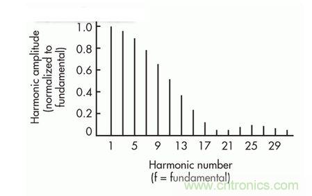 非線性負(fù)載可使諧波大小與線路頻率下的基本諧波電流具有可比性。圖4顯示了相對(duì)于線路頻率下的基本諧波大小進(jìn)行標(biāo)準(zhǔn)化的高階諧波電流大小。不過,只有圖1中給出的在與線路頻率相同的頻率下且與電源線電壓同相的諧波電流(在此案例中為線路頻率下的基本諧波)對(duì)提供給負(fù)載的平均功率起作用。這些諧波電流會(huì)影響同一電力線上的其他設(shè)備的工作情況。