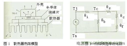 散熱器是開關電源的重要部件,它的散熱效率高與低關系到開關電源的工作性能,散熱器通常采用銅或鋁,雖然銅的熱導率比鋁高2倍但其價格比鋁高得多,故目前采用鋁材料的情況較為普遍,通常來講散熱器的表面積越大散熱效果越好,散熱器的熱阻模型及等效電路如圖1所示。