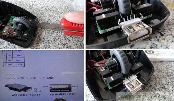 開USB座口,引腳定義,只要兩邊的兩個腳,也就是+5V和地。