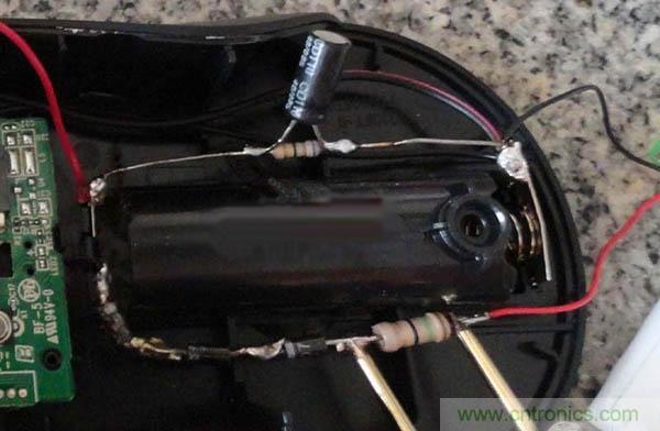 新加的鋰電正極通過15歐限流電阻和三個IN4007降壓,接到原電池正極,給鼠標供電。