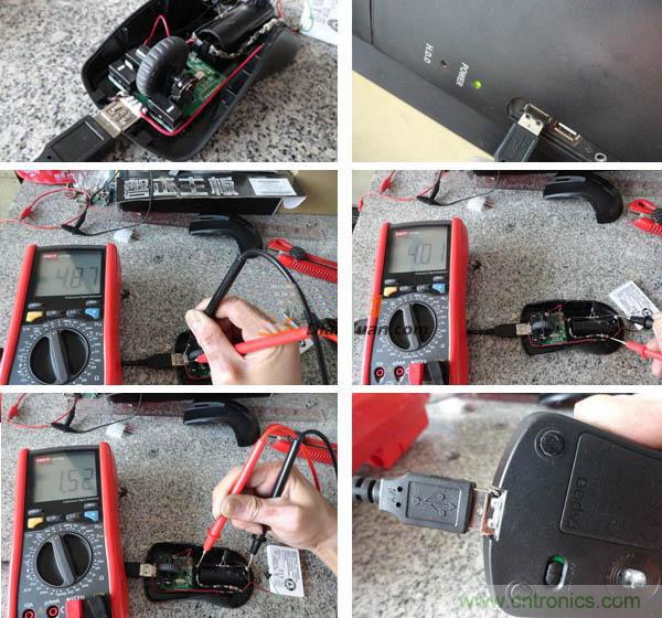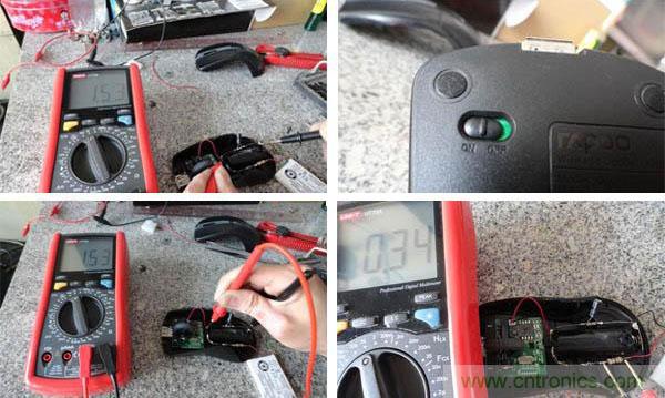 在萬用表測試后,我們能夠看到接入后USB電壓為4.87V,鋰電池兩端為4.01V。負載端為1.52V,再次打開鼠標電源開關。出現1.54V,竟然還高了,這個應該關系到阻抗和容抗問題,水平不夠,不好解釋,反正就當它正常了。