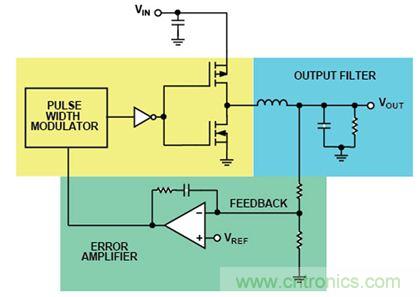 將典型開關電源輸出電壓(圖1)與內部基準電壓進行比較,可看到差別集中在脈寬調制器(PWM)。PWM將斜坡與放大器輸出進行比較,生成PWM信號來控制開關,從而向負載供電。