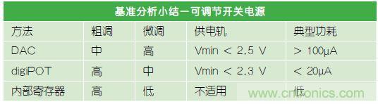 控制誤差放大器引腳電壓,便可調整輸出電壓。這可以通過使用DAC,或者使用數字電位計,以外部方式實現,如圖2所示。某些電壓調節器允許使用串行接口(比如PMBus、I2C或SPI)在內部控制反饋電壓。表1比較了三種方法的調整能力和功耗。