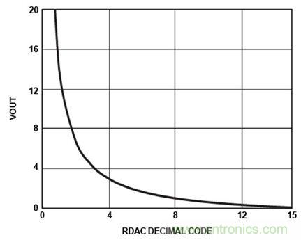 以RAW和RWB代替R1和R2可實現對數傳遞函數。數字碼和輸出電壓之間的非線性關系降低了低端分辨率。圖5顯示了這個取自數字電位計的對數傳遞函數。