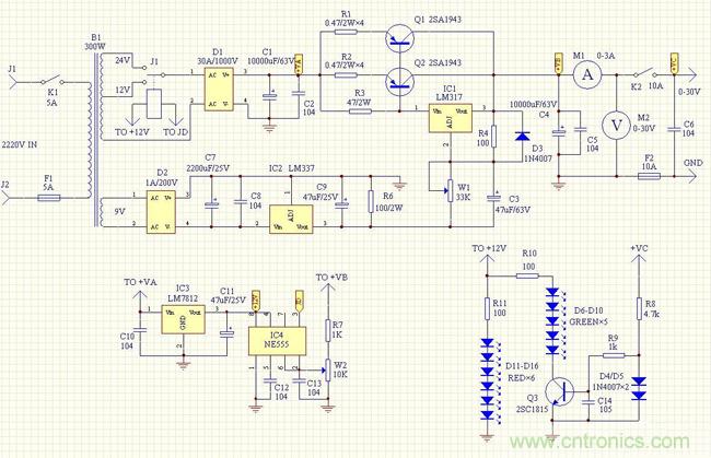 圖:簡單易制、低廉高效的0-30V/10A可調(diào)穩(wěn)壓電源電路原理