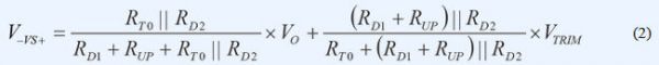 VS+引腳上的正常工作電壓為1V。若 VTRIM為1V左右且RT0遠(yuǎn)大于RD2,則可忽略電路的其余分支部分。復(fù)合網(wǎng)絡(luò)用作簡(jiǎn)單分壓器,并調(diào)節(jié)RUP電阻值,提供類(lèi)似于模擬控制器的特性,實(shí)現(xiàn)了模擬電源模塊中的電壓向上調(diào)整。