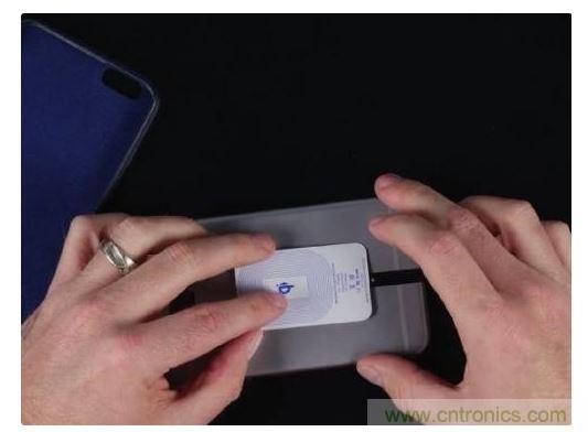 3、接下來的任務就是將接收器的金屬觸電與智能手機電池連接了,這是整個過程中最有難度的部分。不過只要細心,保證每一個金屬觸電都連接到一起就可以弄好。調整好位置后,將模塊貼到電池上;