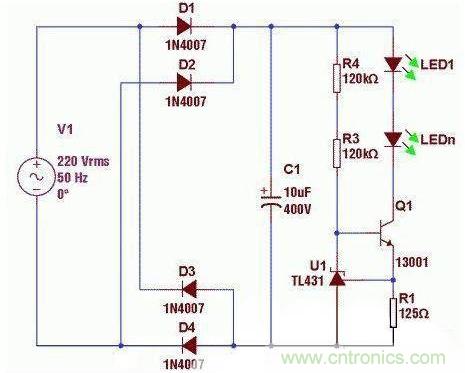 這種電路的原理非常簡單,主要利用了431的2.495V的基準(zhǔn)來做恒流,并且同樣限制了LED上面的壓降,但優(yōu)點與缺點同樣明顯。