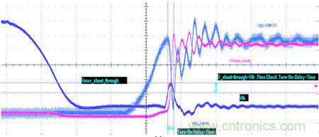 測試的目的是看上MOS管導(dǎo)通時,有沒有同時把下管打開,從而導(dǎo)致電源直接導(dǎo)通到地而引起短路。如圖三所示藍色曲線(Vgs_Lmos)就是下管在上管導(dǎo)通的同時,被帶了起來,如果藍色曲線的被帶起來的尖峰超過了MOS管的Vth要求,同時持續(xù)時間(Duration)也超過了datasheet要求,從而就會有同時導(dǎo)通的風(fēng)險。當然,這是大家最常見到的情況。