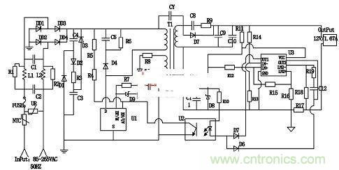 具體的工作原理是:NCS1002調(diào)節(jié)輸出的電壓值,當(dāng)輸出電壓超過(guò)設(shè)定電壓值時(shí),電流流向光耦LED,從而下拉光耦中晶體管的電流。當(dāng)電流超過(guò)TNY279的使能引腳的閾值電流時(shí),將抑制下一個(gè)周期,當(dāng)下降的電壓小于反饋閾值時(shí),會(huì)使能一個(gè)開關(guān)周期,通過(guò)調(diào)節(jié)使能周期的數(shù)量,對(duì)輸出電壓進(jìn)行調(diào)節(jié),同樣,當(dāng)通過(guò)檢測(cè)到R16上的電流即輸出電流大于設(shè)定的值時(shí),電流通過(guò)另一個(gè)二極管下拉光耦LED中晶體管的電流,達(dá)到抑制TNY279的下一個(gè)周期的目的,當(dāng)輸出電流小于設(shè)定電流時(shí)會(huì)使能一個(gè)開關(guān)周期,通過(guò)這樣的反饋調(diào)節(jié)機(jī)制,能使得輸出的電壓和電流都處于穩(wěn)定的狀態(tài)。