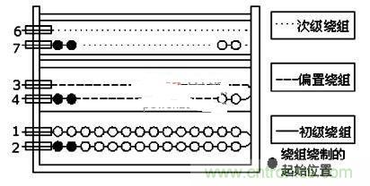 圖3:變壓的初級(jí)、次級(jí)和偏置繞組的繞制示意圖