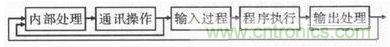 在延遲控制中,傳統(tǒng)的繼電器控制技術(shù)依靠設(shè)備的滯后性實現(xiàn),定時精度較差,在操作時不易調(diào)整時間。而PLC監(jiān)視控制是時鐘脈沖由晶體振蕩器引起的,可操控時間,且精度較高。PLC控制雖與微電腦技術(shù)相似,但工作方式卻不同。PLC技術(shù)采用循環(huán)掃描,而微機(jī)則采用鍵盤掃描,圖1是PLC技術(shù)的工作掃描方式。