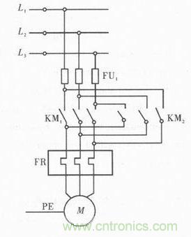 在眾多的操作系統(tǒng)中均要求電動機(jī)能夠?qū)崿F(xiàn)正反轉(zhuǎn)給操作,從電動機(jī)的工做原理中可知,需將三相電源中的任意兩個進(jìn)行對調(diào),就能實現(xiàn)電動機(jī)的反向運轉(zhuǎn),因此電動機(jī)實現(xiàn)正反轉(zhuǎn)的實質(zhì)便是電源進(jìn)線的調(diào)換。但若僅調(diào)換進(jìn)線,容易導(dǎo)致電源短路,因此必須設(shè)置互鎖,圖2是三相異步電動機(jī)正反轉(zhuǎn)的原理設(shè)計圖,圖中KM1和KM2均是交流接觸器主觸頭,當(dāng)KM1吸合時,KM2交流接觸器主觸頭就會斷開,然后便可實現(xiàn)電機(jī)的正轉(zhuǎn)。若是斷開交流接觸器主觸頭KM1,KM2就會吸合,此時電動機(jī)則會實現(xiàn)反轉(zhuǎn),圖中的FU1主要用于防止電源短路,圓形代表電機(jī)M。