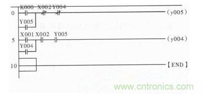 在圖3梯形圖中,PLC外部按鈕所控制的常開觸點主要是左母線的第一等級以及第二等級的X001觸點和X002觸點,只需按鈕便可使得X000或X001任意一個常開觸點閉合,輸出繼電器Y005或繼電器Y004就能通過相應(yīng)線路形成閉合回路,進(jìn)而使常開接觸點Y005或Y004實現(xiàn)自鎖功能同時實現(xiàn)電動機(jī)的正反轉(zhuǎn)。停止通過PLC外部的按鈕實現(xiàn),按鈕通過釋放X002常開接觸點,使得繼電器斷電引發(fā)電動機(jī)停止運轉(zhuǎn)。