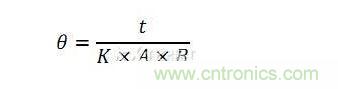 變量l是通孔的長度(從頂面銅層到底面銅層)。電路板上焊接電源模塊的地方沒有阻焊層,但對其他區域,PCB設計工程師可能要求在每個通孔的頂部放置阻焊層,否則通孔上面的區域會空缺。由于通孔只連接外銅層,所以其長度為63.4密耳(0.0634英寸)。總通孔長度本身的熱阻是167°C/W,如式3所示。