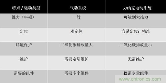 與氣動相比有多種突出優勢,下圖是力納克電動系統和氣動系統進行的簡單比較: