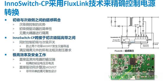 此次最新發(fā)布的InnoSwitch-CP采用Fluxlink技術(shù)來(lái)精確控制電源輸出特性,是典型的次級(jí)側(cè)控制方式的電源方案。IC內(nèi)部初次級(jí)側(cè)各有一個(gè)控制器,初級(jí)側(cè)還集成了一個(gè)功率MOSFET,,次級(jí)側(cè)控制器實(shí)現(xiàn)對(duì)輸出電壓和電流的監(jiān)測(cè),根據(jù)監(jiān)測(cè)結(jié)果將信息反饋至初級(jí),進(jìn)行相應(yīng)的開(kāi)關(guān)控制,從而實(shí)現(xiàn)更精確的輸出電壓和電流的控制。此外InnoSwitch-CP配置了次級(jí)側(cè)的同步整流驅(qū)動(dòng)技術(shù),可以大大提升電源效率,改善充電器溫升。采用次級(jí)側(cè)控制器同時(shí)控制初級(jí)和次級(jí)兩個(gè)開(kāi)關(guān)管的開(kāi)關(guān),可以防止某些情況下可能出現(xiàn)的兩個(gè)開(kāi)關(guān)管同時(shí)開(kāi)通的現(xiàn)象,從而避免災(zāi)難性的故障發(fā)生。相對(duì)于其它采用兩個(gè)控制器分別控制初級(jí)和次級(jí)MOSFET的方案,InnoSwitch-CP可以實(shí)現(xiàn)更加可靠的同步整流工作控制,任何情況下都不會(huì)出現(xiàn)初級(jí)和次級(jí)兩個(gè)開(kāi)關(guān)同時(shí)導(dǎo)通的情況,從而大大提高可靠性。
