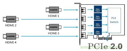 針對圖三中主流的四通道架構(gòu),PLX Switch可以選擇PEX8608,客戶如果有更多通道需求,如八通道,建議選擇PEX8618,但具體要根據(jù)客戶數(shù)據(jù)量來決定,系統(tǒng)架構(gòu)完全一致,對項目來說,只需要更換PCIE Switch就可以滿足不同應(yīng)用需求,軟件方面無需改動,加速上市時間,搶占市場。