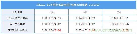 測試結果顯示,在測試的兩個時段(快速充電階段/涓流充電階段)使用第三方充電器與iPhone原裝充電器的輸出功率基本一樣,此時充電速度相當,而帶USB輸出的插板此時輸出電壓比較大,輸出功率也領先于另外兩者。所以充電速度排名(估測)為:帶USB的插座》iPhone原裝充電器=第三方充電器(由快到慢)。當然,不同的第三方充電器/帶USB的插座有不同輸出的效果。