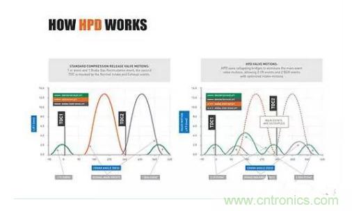 雖然發(fā)動機制動設計效果顯著,但是增加的車輛總重、車輛較低的滾動阻力和低排量發(fā)動機都要求更強的輔助制動功率,Jacobs的解決方案是高功率密度HPD 發(fā)動機制動系統(tǒng)。在高功率密度發(fā)動機制系統(tǒng)中,橋接器、控制閥和液壓執(zhí)行機構(gòu)都與常規(guī)裝置系統(tǒng),共同應用到進氣凸輪。驅(qū)動階段發(fā)動機保持四沖程模式,制動 階段發(fā)動機切換到兩沖程模式,從而制動沖程的數(shù)量加倍。Jacobs解決方案能夠更高效地利用渦輪增壓器,控制其最優(yōu)化制動充壓效果。