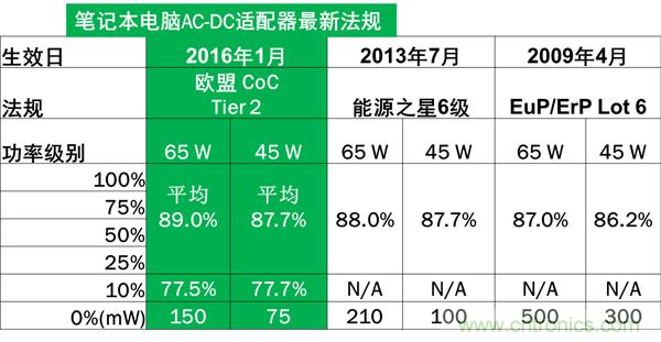 如于2016年1月1日生效的歐盟CoC V5 Tier 2 規(guī)定,輸出功率為45 W和65 W的AC-DC適配器平均能效需分別達到87.7%和89%,待機功耗分別低于75 mW和150 mW,并且還要求10%負載條件時的能效需分別達到77.7%和77.5%。電源設計工程師面臨體積、能效和成本等多方面的設計挑戰(zhàn)。