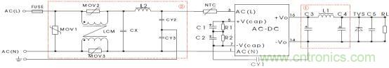 LS03-16BxxSS系列電源,如果需應(yīng)用在電磁環(huán)境比較惡劣的場(chǎng)合中,為使產(chǎn)品工作穩(wěn)定且不被電磁干擾輕易損壞,建議在電源輸入端口增加相應(yīng)的EMC外圍電路,以滿足一定指標(biāo)的電磁兼容性能,如圖(二)所示為推薦電路供參考:
