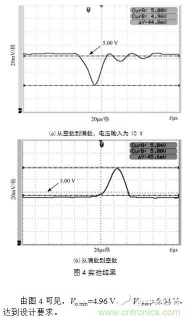 采用電阻器作為負載,并用開關分別接入和斷開進行了從空載到滿載和從滿載到空載的實驗,輸出電壓的波形如圖4所示。