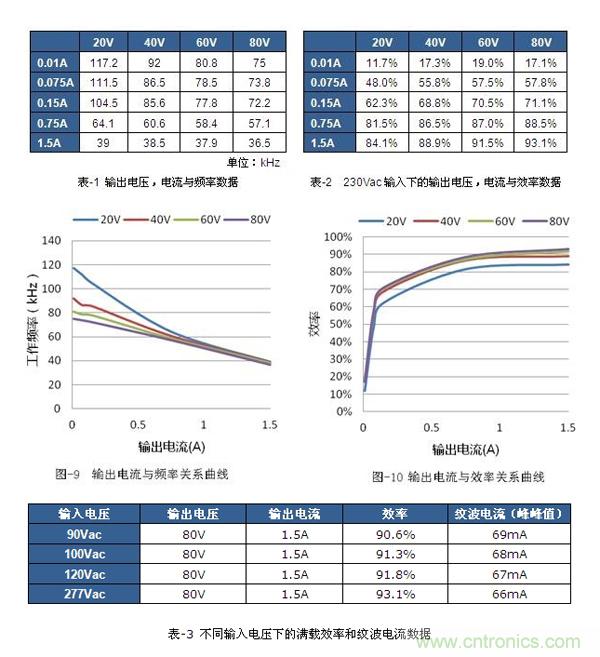 在230Vac的輸入條件,80V、1.5A的條件下得到最高的效率93.1%。詳細數據如表-2和圖-10所示。表-3是全電壓范圍下的滿載效率和紋波電流數據??梢钥闯黾y波電流的表現也很優秀,峰-峰值小于2.5%,都在70mA以下。