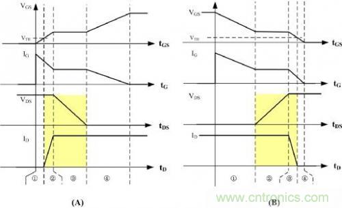 開關導通時對應的波形圖如圖2(A),開關截止時對應的波形圖如圖2(B),可以看到開關管每次導通、截止時開關管VDS電壓和流過開關管的電流ID存在交疊的時間(圖中黃色陰影位置),從而造成損耗P1,那么在開關頻率fs工作狀態下總損耗PS= P1 *fs,即開關頻率提高時,開關導通與截止的次數越多,損耗也越大。
