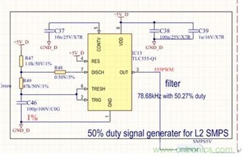 前級電源屬于典型定壓設(shè)計(jì),無需給出設(shè)計(jì)原理,本文重點(diǎn)介紹后級半橋電路。具體原理圖見圖2和圖3。圖2為采用汽車級定時(shí)器電路設(shè)計(jì)的50%占空比信號發(fā)生器,用于給半橋開關(guān)電源提供控制信號,其中R49可以用來調(diào)整開關(guān)頻率,一般可以設(shè)定在70kHz到300kHz之間,頻率選擇主要根據(jù)電路板實(shí)際空間尺寸和變壓器的伏秒積進(jìn)行折衷選取。