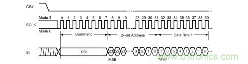 其實,無論是對芯片的擦除,編程還是讀取操作,我們大致可以按照以下的套路來:寫命令---寫地址---寫(讀)數據。正如以下的時序圖一樣清晰明了,我們先把片選信號拉低,再發個0x02頁編程命令,再發個地址,就可以輕松寫數據了。