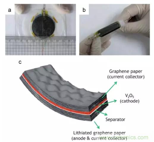 3.柔性石墨烯有望制造柔性儲能裝置。使用石墨烯及其組件可以制備出具有高度柔韌性的集流體,為我們提供了一種取代脆性金屬集流體的方法。此外,利用石墨烯還能制備出集成柔性電極,有助于解決在反復(fù)彎曲過程中集流體活性材料分離的問題。