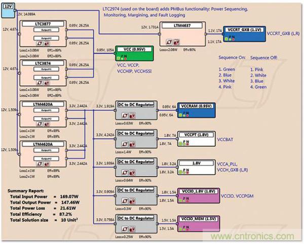 圖 3:用于 Arria 10 GX FPGA 電路板 (圖 1) 的電源樹。用 LTpowerPlanner 設(shè)計(jì),該軟件是一款分析性和簡(jiǎn)便易用的初步設(shè)計(jì)工具以用來映射電源要求。