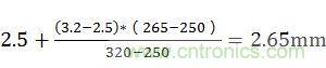 爬電距離計算:按照污染等級2、材料類別Ⅲ可知265V有效值電壓在表2N的250V和320V之間,而250V時基本絕緣為2.5mm,320V的基本絕緣為3.2mm,即265V電壓基本絕緣為