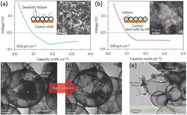 c-e)鋰沉積(c)、原位電子束加熱(d)后具有Au NPs的納米膠囊,鋰沉積后沒有Au NPs的碳?xì)ぃ╡)的TEM圖像。