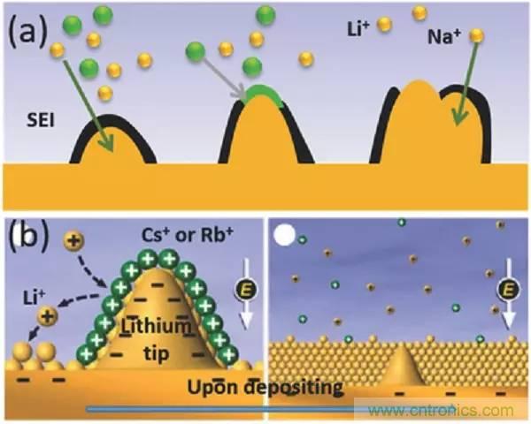 b)自愈式靜電屏蔽機(jī)制。Cs+或Rb+將積聚在尖端附近以形成靜電屏蔽,排斥Li+沉積在負(fù)極附近區(qū)域。