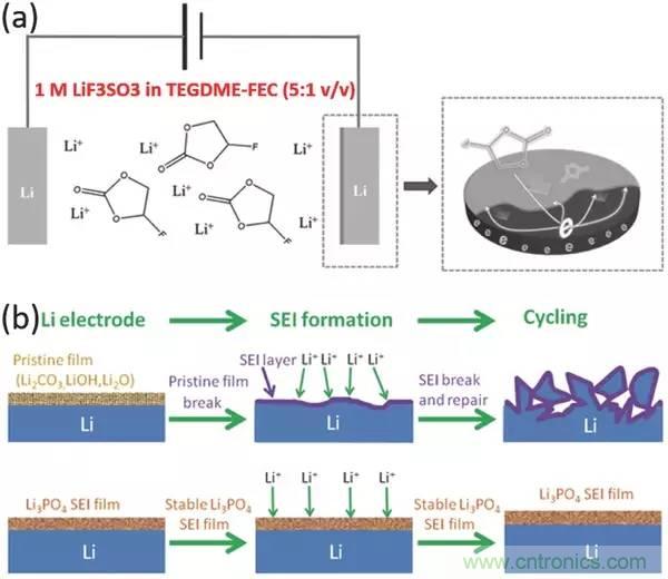 a)在Li-O2電池組裝之前,在含有1 M LiF3SO3的TEGDME-FEC(5:1 v/v)電解質(zhì)中,鋰負(fù)極上保護(hù)膜的電化學(xué)形成;