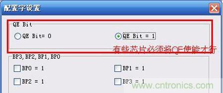 芯片中的配置參數需要手動修改,不能單純的加載文件后直接進行燒錄,如果不按照正確的規則設置參數,必然會導致芯片無法正常運行。在SPI Flash的芯片燒錄時經常遇到這類問題,類似于”QE”位必須使能,如下圖。