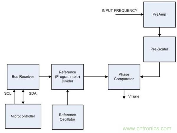 微控制器通過 I2C 發送數據到可編程分頻器。該分頻器也接收來自參考振蕩器(例如 4 MHz 晶體振蕩器)的輸入。相位比較器(即相位檢測器)通過預分頻器接收本地振蕩器頻率(例如 87.15 MHz),還通過參考分頻器和參考振蕩器接收微控制器的輸入(例如,87.15 MHz)。如果兩個輸入都匹配,相位比較器將提供 Vtune 調諧電壓。一旦本地振蕩器頻率與微控制器頻率數據之間稍有不匹配,都將無法提供調諧電壓 (Vtune) 和輸出。圖 3 所示為完整的框圖。