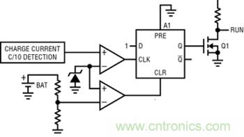 前述電路的方框圖如圖 1 所示。該電路基于一個 D 觸發器。隨著充電電流值降至預設定的 C/10,D 觸發器時鐘變為高電平,外部晶體管 Q1 將 RUN 引腳拉至地,并關斷 LTC4012。電池充電,電壓接近最大值。隨著充電器關斷,電池開始放電,最終達到最小電壓,D 觸發器清零,然后 Q1 關斷,充電周期重復。