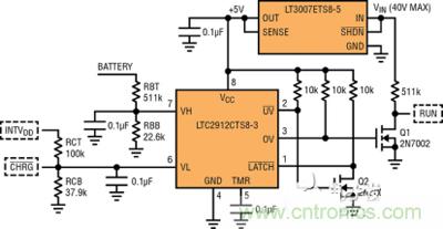 在充電過程中,LTC4012 的 /CHRG 引腳處于低阻抗狀態,這使 VL 引腳連至 GND。隨著充電電流降至 C/10,/CHRG 引腳改變狀態,VL 引腳上的電壓隨之上升。當這個引腳上的電壓達到 0.5V (電阻器分壓器 RCT/RCB) 時,OV 引腳的狀態從低電平變為高電平,Q1 接通,RUN 引腳拉低,LTC4012 進入停機模式。/LATCH 引腳為低電平,U1 將 OV 鎖定為高電平,直至電池電壓再次降至 12V 且這個過程開始重復為止。建議的電路與 LTC4012 互連,相應引腳由虛線圍繞,以與 LTC2912 U1 的引腳相區分。