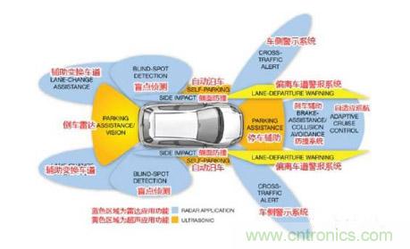 ADAS(高級輔助駕駛系統),是指利用安裝于車上各式各樣的傳感器,在第一時間收集車內的環境數據,進行靜、動態物體的辨識、偵測與追蹤等技術上的處理,從而能夠讓駕駛者在最快的時間察覺可能發生的危險。通常包括導航與實時交通系統TMC,電子警察系統ISA 、自適應巡航ACC 、車道偏移報警系統LDWS、車道保持系統,碰撞避免或預碰撞系統、夜視系統、自適應燈光控制、行人保護系統、自動泊車系統、交通標志識別、盲點探測,駕駛員疲勞探測、下坡控制系統和電動汽車報警系統等。