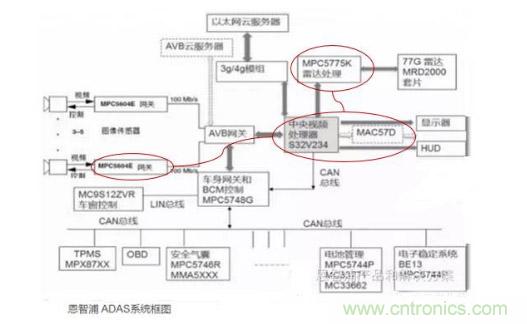 NXP已經發布Blubox平臺,為OEM廠商提供設計、制造、銷售Level 4級(SAE)無人駕駛汽車的解決方案計算平臺。下圖是NXP的ADAS系統框圖,該系統對多路視頻、77G雷達的數據進行融合處理,然后傳送給云端和車身系統。我們看到NXP是能夠提供全套Reference方案的公司,在這一塊的產品線很全,雖然現在沒有做更多的芯片集成,而是提供相對分散的芯片及解決方案。我們這里重點介紹一下中央處理器S32V234和MPC5775K,MPC5775K是對雷達數據進行處理,而S32V234是對多傳感器處理過的數據進行融合分析,通過CAN總線,把結果傳給車身系統。
