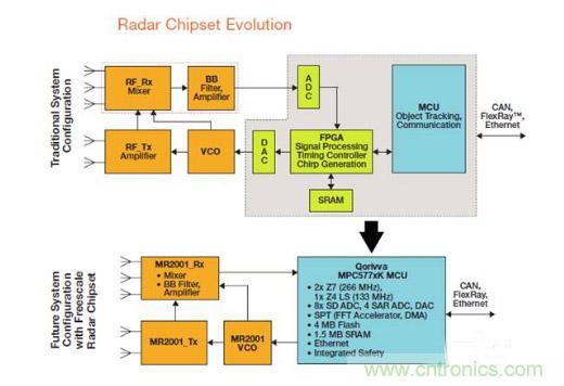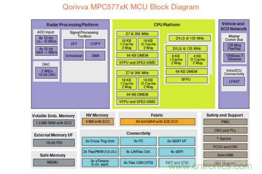 QorivvaMPC567xK系列基于Power Architecture® 的32位MCU,MPC577XK是專門的雷達信息處理芯片,該系列增加了芯片的存儲器,提升了運行速度和性能,能夠支持自適應巡航控制、智能大燈控制、車道偏離警告和盲點探測等應用。從整個雷達系統來看,結合77G雷達收發器芯片組、Qorivva MPC567xK MCU、FPGA, ADC, DAC, SRAM, 支持長、中、短距離應用。這里需要重點關注的是信號處理工具集(Signal Processing Toolbox)設計,包括了FFT、DMA、COPY、Scheduler。目前77GHz的FCMW型雷達在數字信號處理中需要使用FFT,即快速傅里葉變換,一般車載雷達的采樣點在512-2048左右,從芯片架構圖我們看到專門的FFT電路。