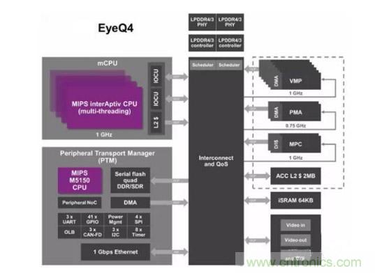 其中特別要指出的是Mobileye的EyeQ系列,已經被多家汽車制造商使用,包括奧迪、寶馬、菲亞特、福特、通用、本田、日產、標致、雪鐵龍、雷諾、沃爾沃和特斯拉等在內。最近的EyeQ4展示的性能已經達到2.5 萬億次每秒的性能,其運行功率可低至3W。從硬件架構來看,該芯片包括了一組工作在1GHZ的工業級四核MIPS處理器,以支持創新性的多線程技術能更好的進行數據的控制和管理。多個專用的向量微碼處理器(VMP),用來應對ADAS相關的圖像處理任務(如:縮放和預處理、翹曲、跟蹤、車道標記檢測、道路幾何檢測、濾波和直方圖等)。一顆軍工級MIPS Warrior CPU位于次級傳輸管理中心,用于處理片內片外的通用數據。