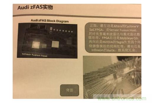 由于目前融合多是雷達與攝像頭融合,所需要的帶寬,一般的ASIC都能夠滿足。但是要融合激光雷達,則最好用FPGA,FPGA做傳感器Hub是最合適不過的。同時傳感器融合目前應用較少,合適的ASIC并不好找,FPGA成為主流選擇。同時,對一些精度要求較高的雷達,如使用單精度浮點處理實現一個4096點FFT,采樣點越多,誤差就越小,但運算量會大幅度增加。它在每個時鐘周期輸入輸出四個復數采樣。每個FFT內核運行速度超過80 GFLOP,這一般需要FPGA才能比較好的實現。一般車載雷達的采樣點在512-2048左右,但軍用的可以達到8192,必須配備FPGA。如下圖在AudizFAS的實物中,采用了Altera的CycloneV SoCFPGA,作為sensor fusion,同時負責毫米波雷達與激光雷達數據處理。